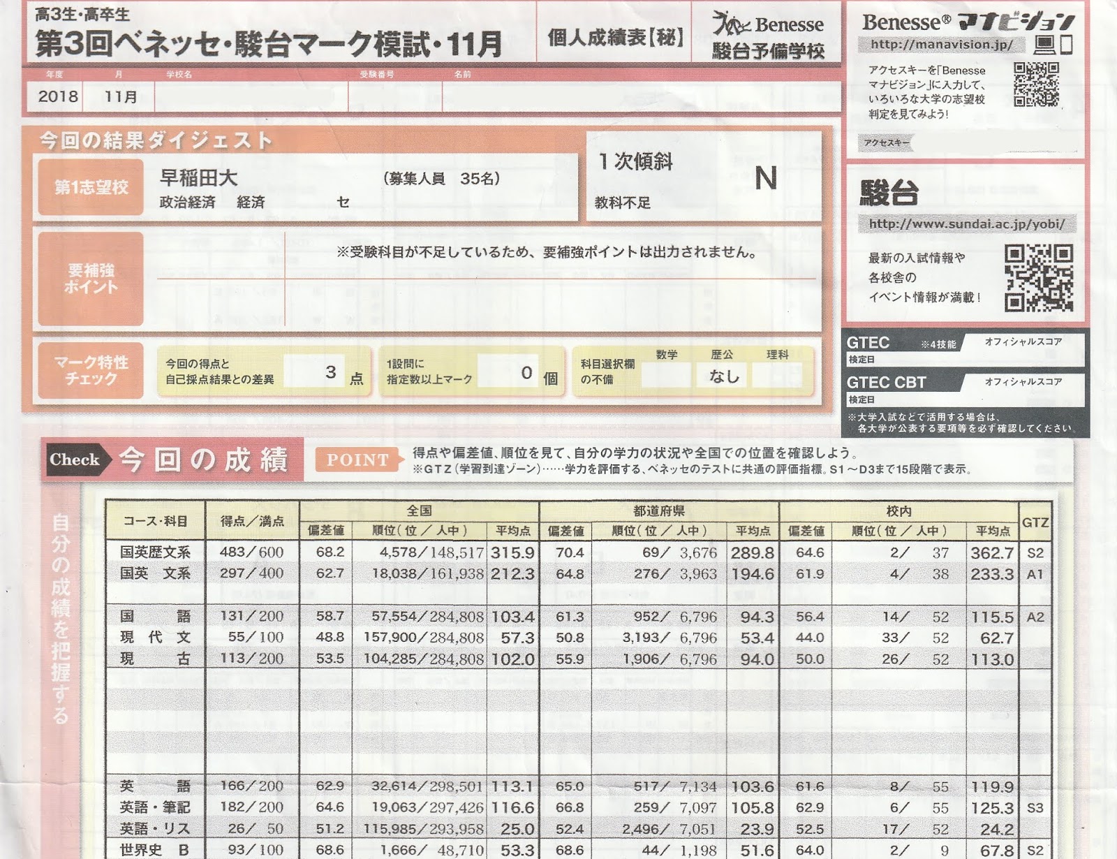 そんな奴が高3になってから勉強を始めてみてもやはり基礎知識すらないのでとても受験生とは思えない点数しか取れないのである